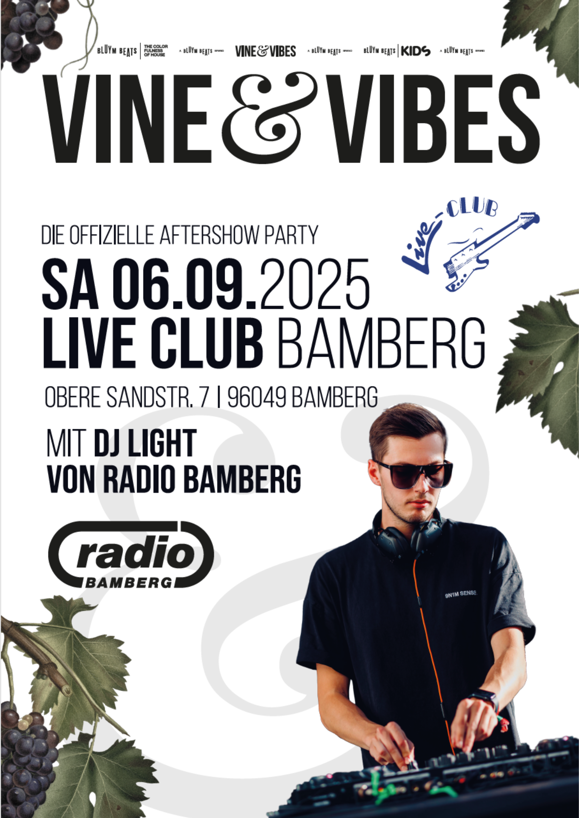 Im Anschluss an das VINE & VIBES (by Bluym Beats) auf dem LUI ONE Gelände geht es ab 22:30 Uhr im Live-Club weiter. DJ J-Light übernimmt die Decks und bringt mit seinen Beats die Tanzfläche zum Beben.