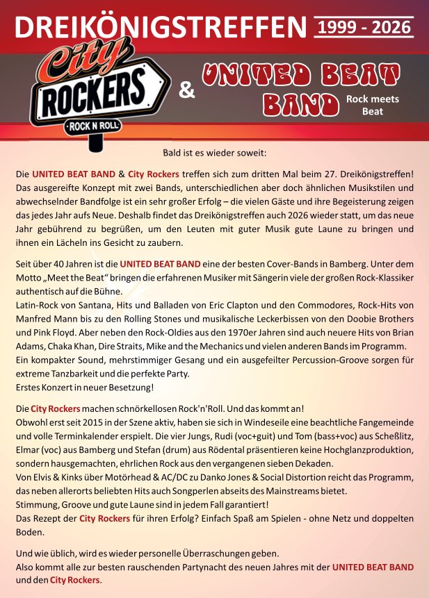 Die UNITED-BEAT-BAND & City Rockers treffen sich zum dritten Mal beim 27. Dreikönigstreffen!