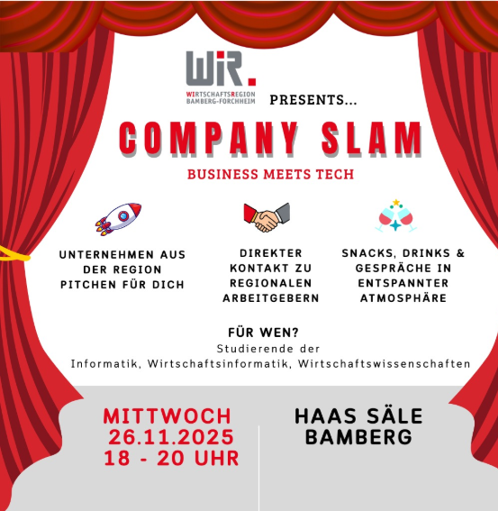 Studierende der Informatik, Wirtschaftsinformatik und Wirtschaftswissenschaften aufgepasst: Beim Company Slam pitchen regionale Unternehmen in kurzen, knackigen Vorstellungen direkt vor euch – live, persönlich und praxisnah.