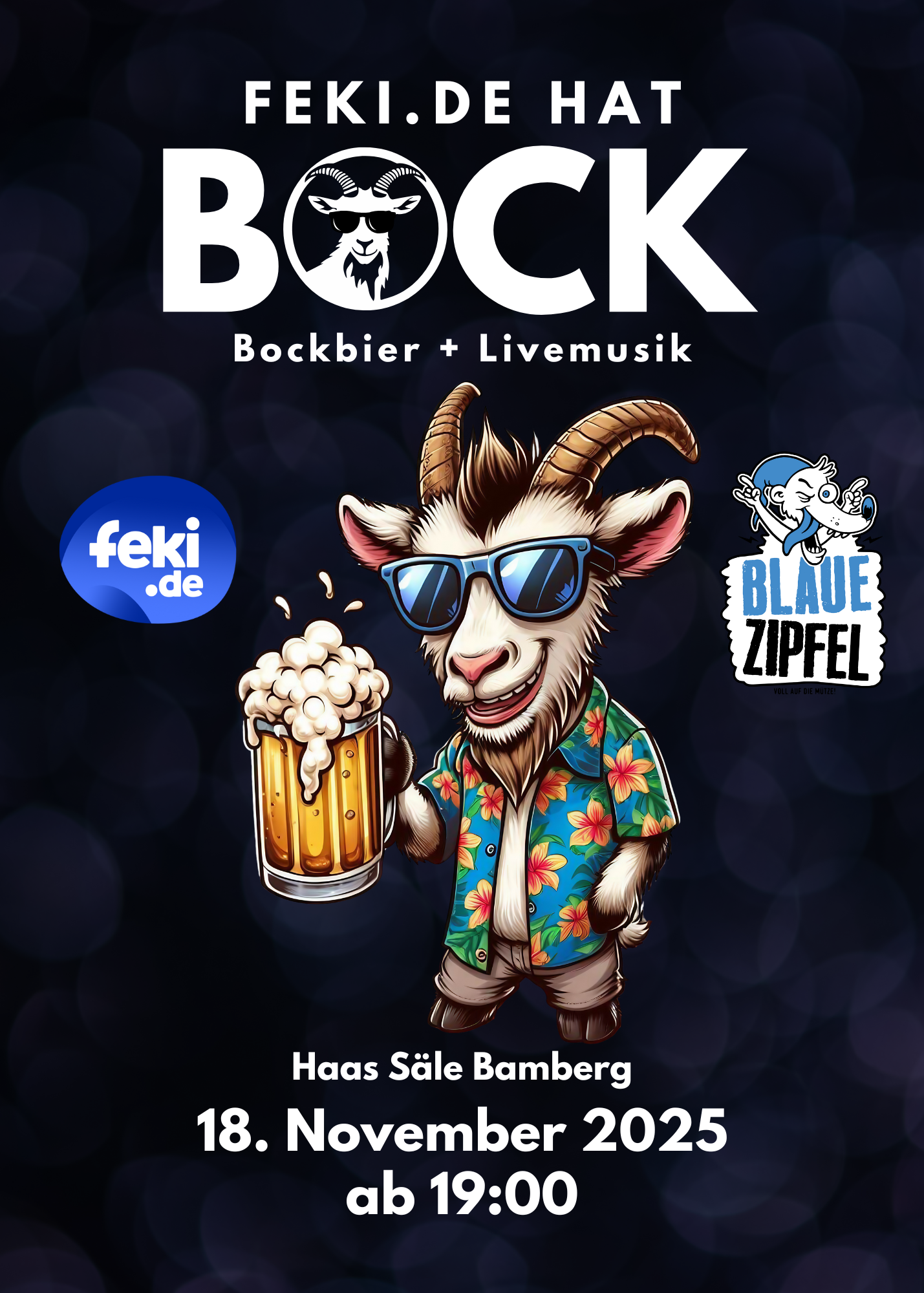 Am Dienstag, den 18.11.2025, wird in den Haas Sälen mit den Blauen Zipfeln der legendäre Feki.de Bockbieranstich gefeiert. Um euren Durst zu stillen, zapfen wir verschiedene Bockbiere von Brauereien aus dem Raum Bamberg. Wer das verpasst, ist selber schuld!